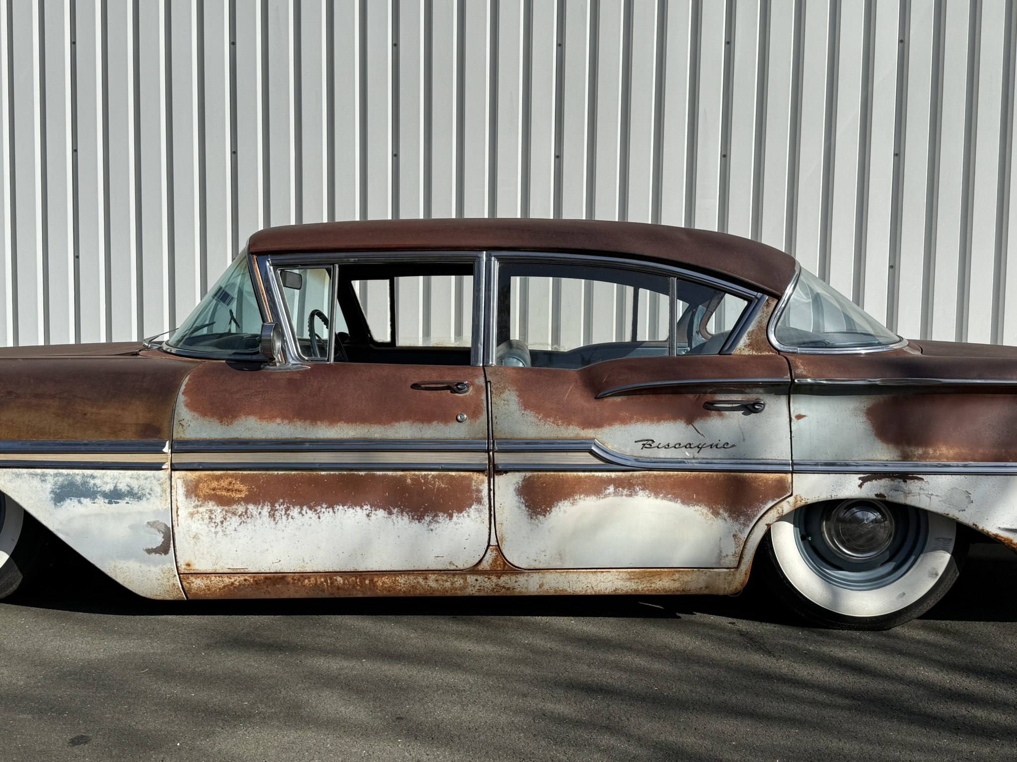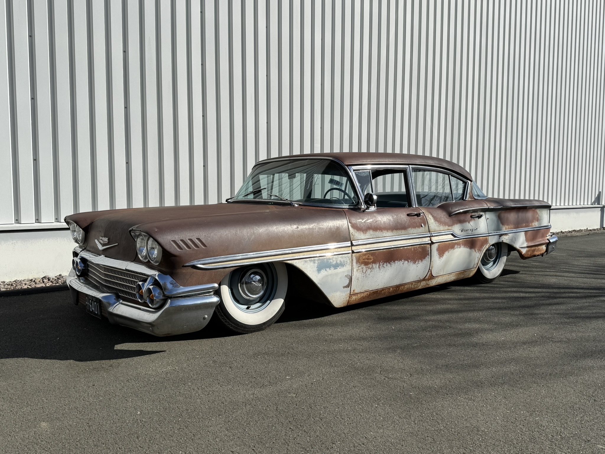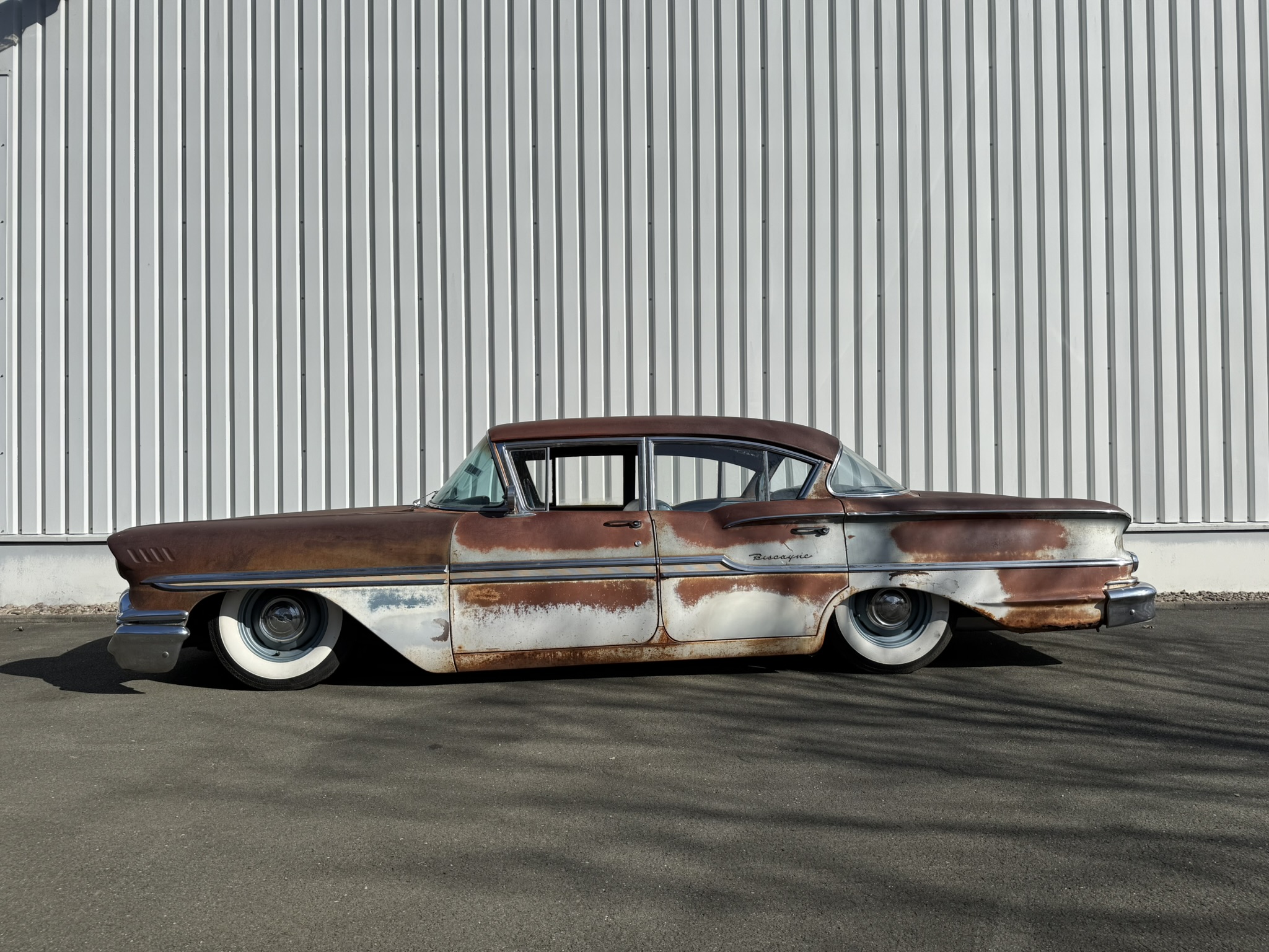 Frisch eingetroffen ! Was fuer ein wundervolles Piece of Americana! Stay tuned! Der Wagen ist gestern bei uns eingetroffen. sweet Patina! Originaler 283V8 2 speed Powerglide. On Air. .Motor schnorrt wie ein Bienchen. 4 x Trommelbremse. älteres Airride System. Der Wagen wurde zum Cruisen benutzt und auf Shows gezeigt. Alles Original bis auf das Airride.. Die Böden wurden natürlich schonmal ersetzt, genau wie der Kofferraumboden. Der Wagen wurde gleich gechanneled sodass ihr den Biscayne bis auf den Boden ablegen könnt, Yes 🙂 Next step for us wäre der Innenraum. Dieser ist original blau. Könnte in Absprache mit dem Käufer auch noch in einen anderen Farbton ( braun oder schwarz etc.) geändert werden und ist nicht im aktuelle Mitnahmepreis enthalten.