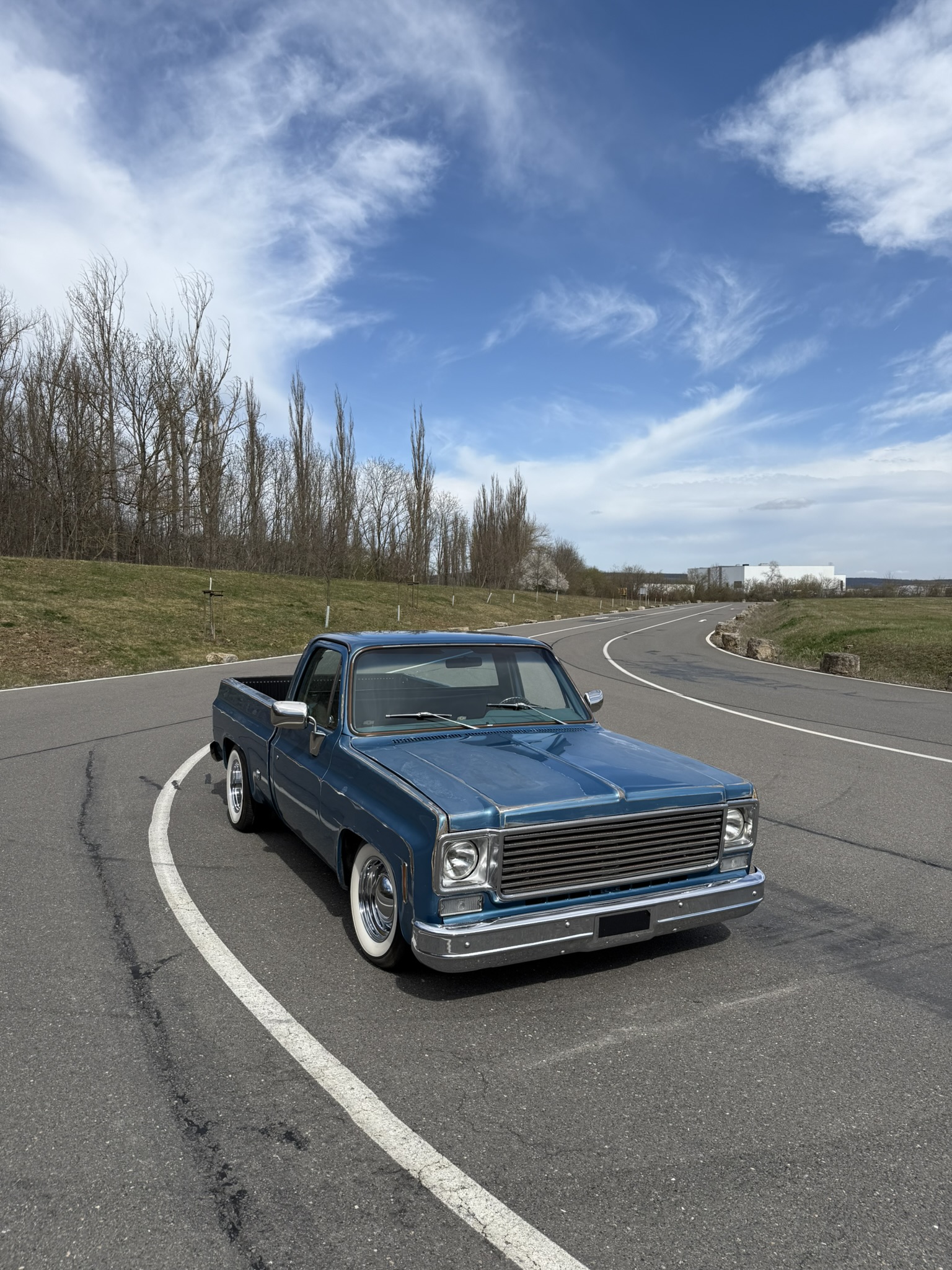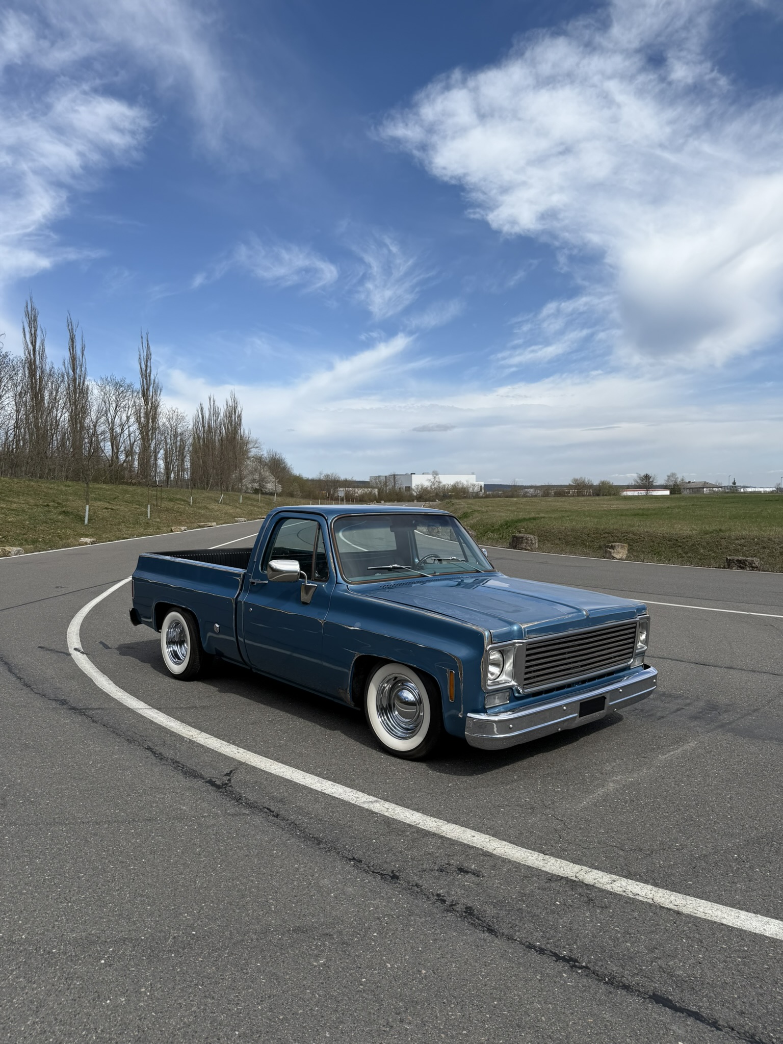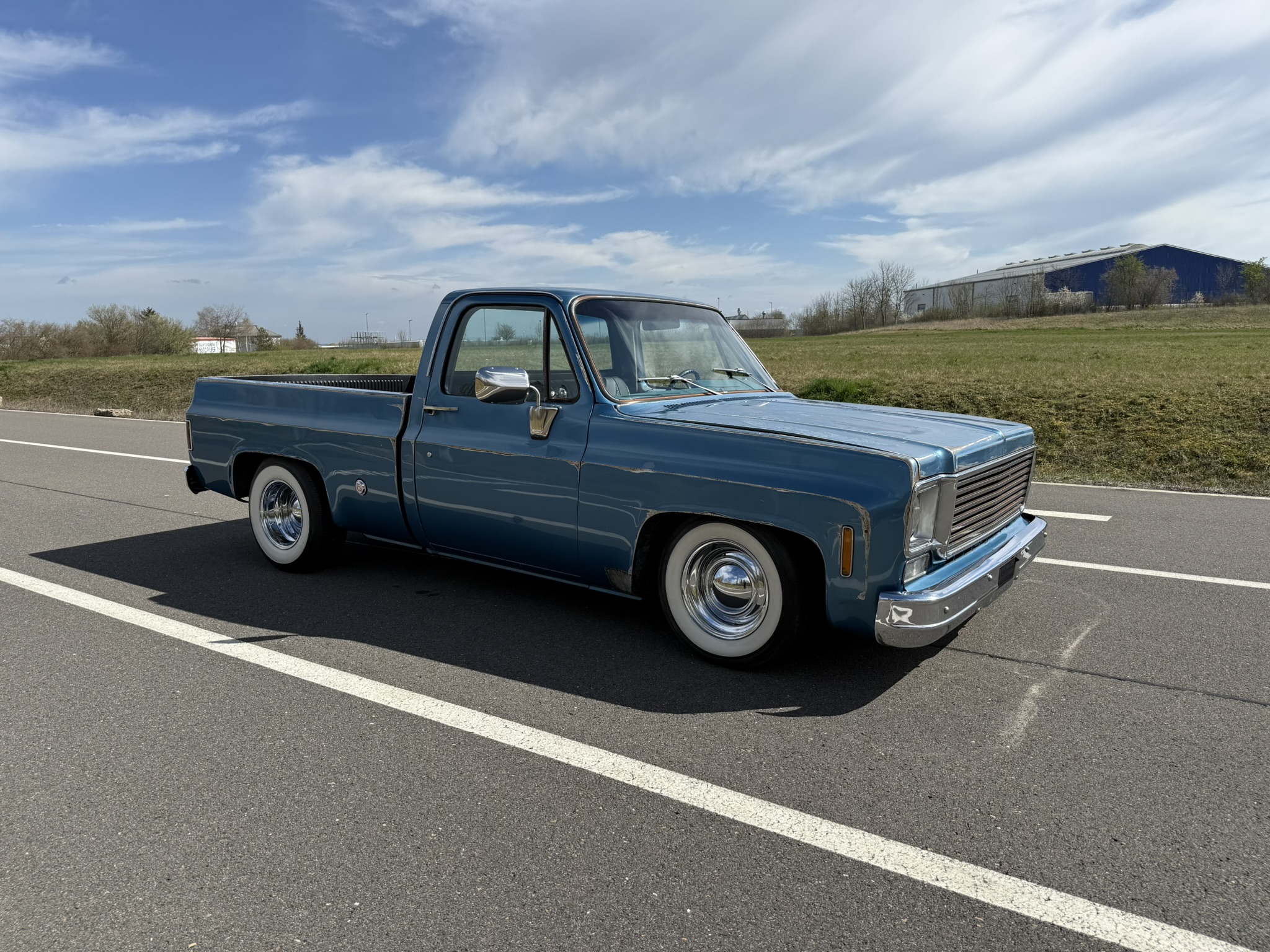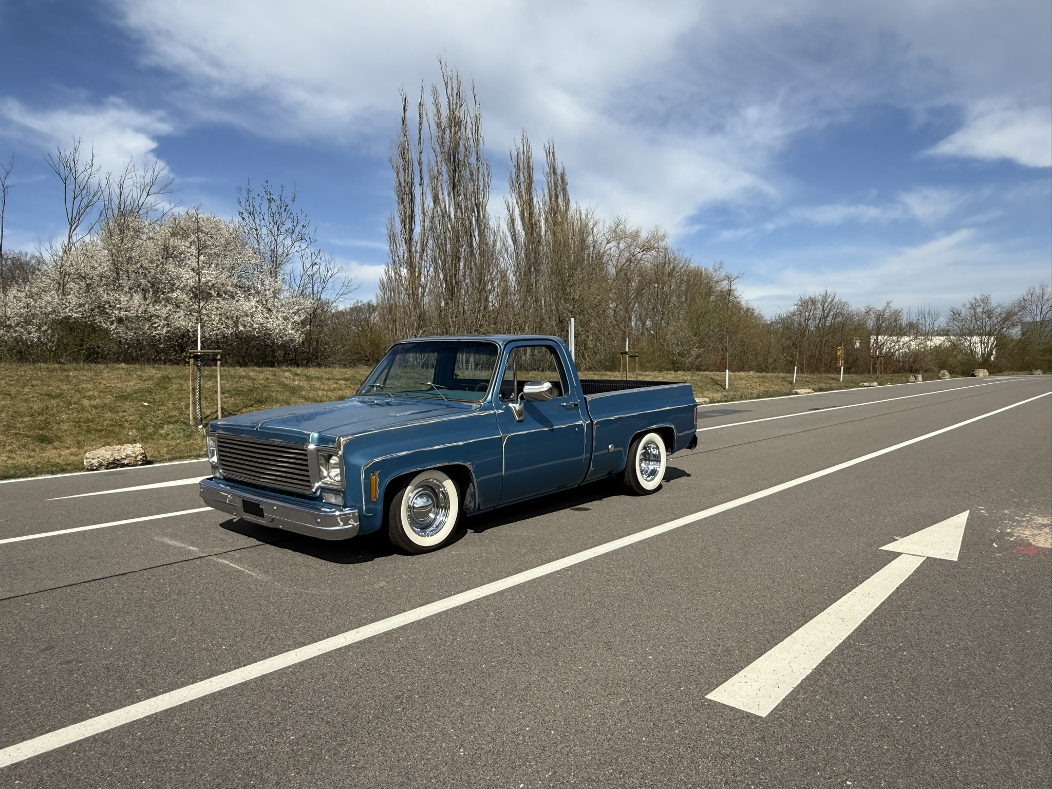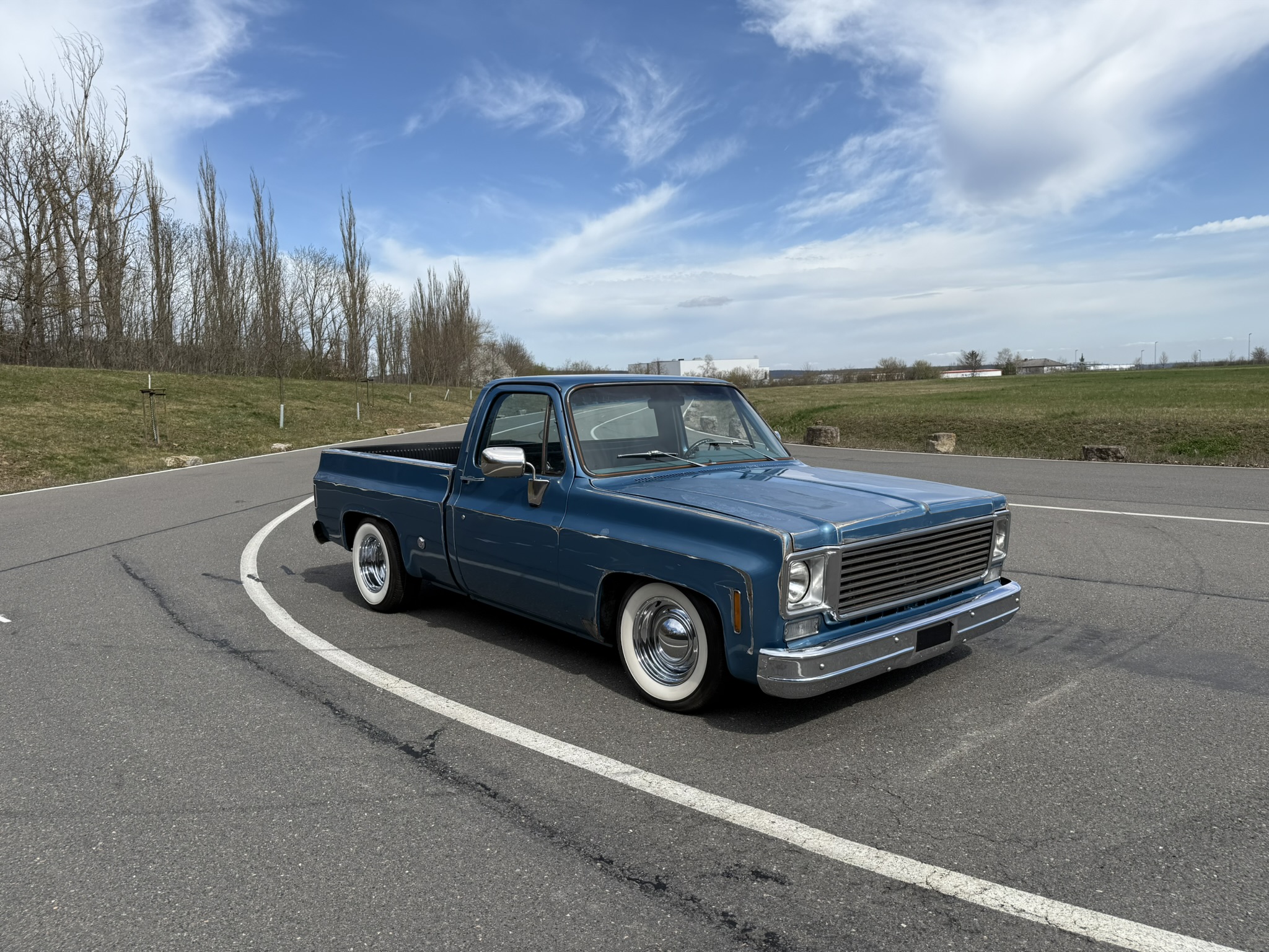 Die sogenannten Round Eyes Squarebody Pickups, so nennt man die erste Generation von 1973-1980, wegen ihrer runden Scheinwerfer, sind zweifellos am Beliebtesten. Dieses schöne Exemplar ist aus dem Jahre 1977 und kommt in der Ausstattungsvariante Cheyenne. Der Wagen hat deutsche Papiere inkl. Tüv und H. Motor ist ein 350V8 mit TH 350Getriebe. Servolenkung und Scheibenbremsen. Er wurde tiefergelegt und kommt auf Chrom Felgen mit Weisswandreifen. Das Fahrwerk ist knackig, aber noch komfortabel. Innen wurde er neu gepolstert mit Chevrolet Applikationen. Custom Grill. Der Lack ist im Used Look und wurde partiell angeschliffen. neue Chrom Stoßstangen vorne & hinten. Der Chevy kommt in der wendigen und gesuchtesten Shortbed Variante (kurze Ladefläche (2m)). Er fährt sich sehr schön und ist ein Hop in and Drive – Fahrzeug.