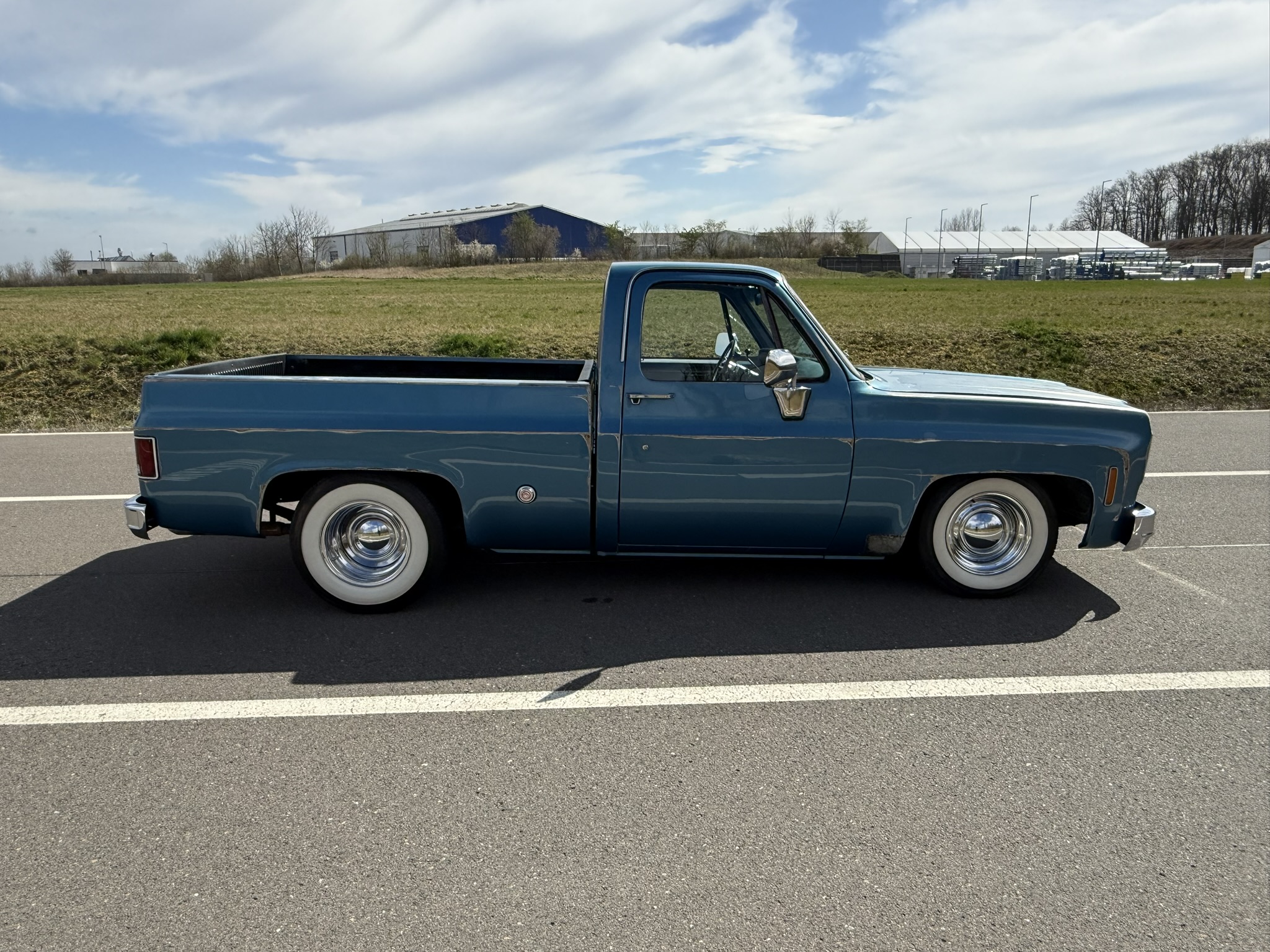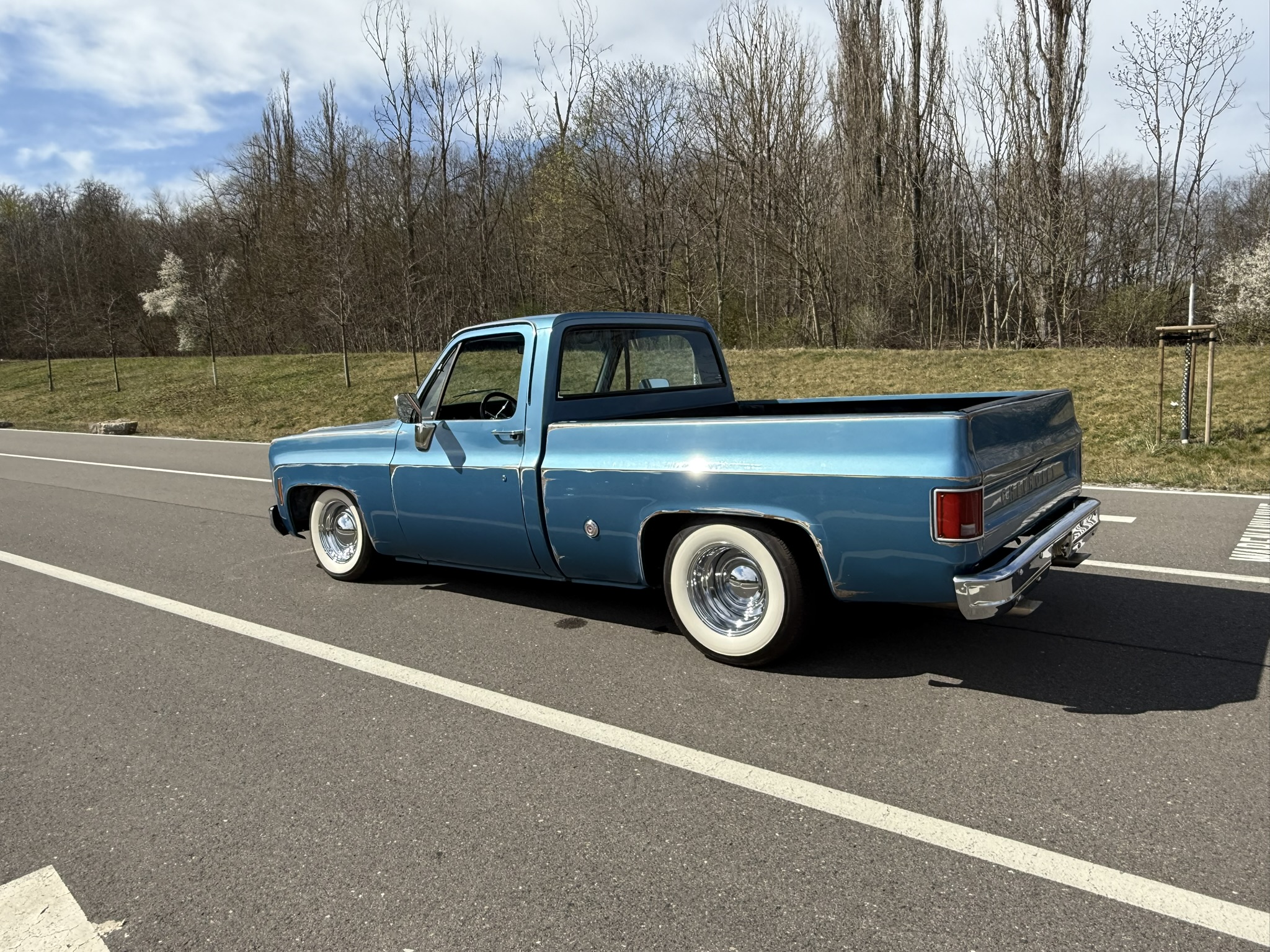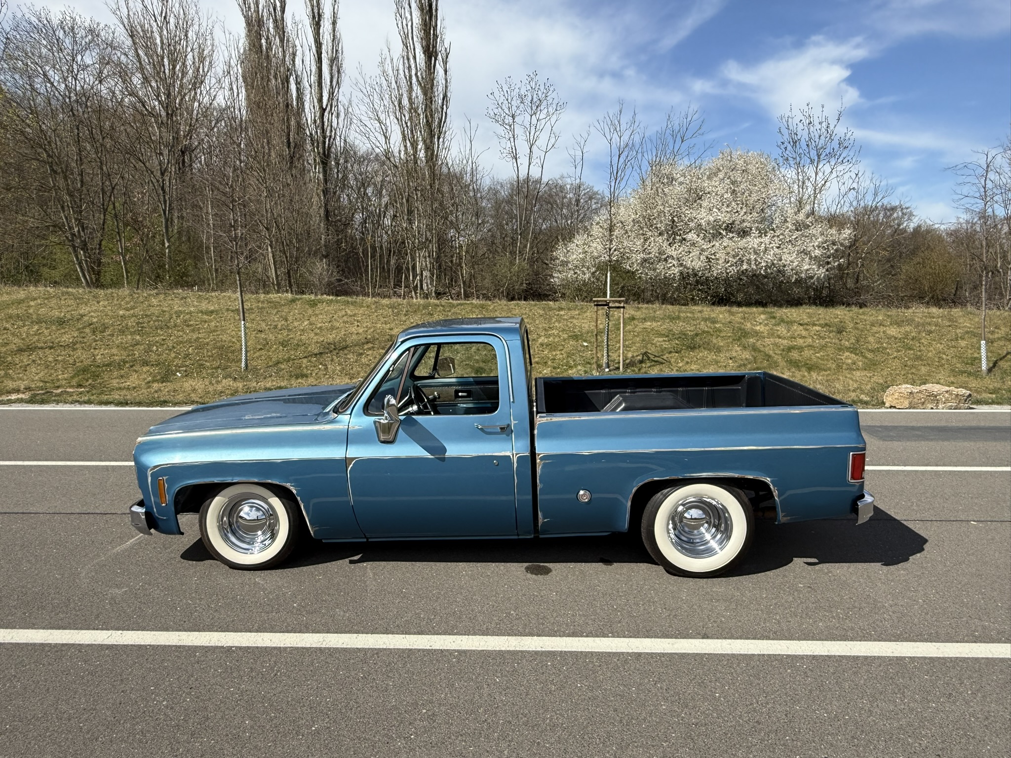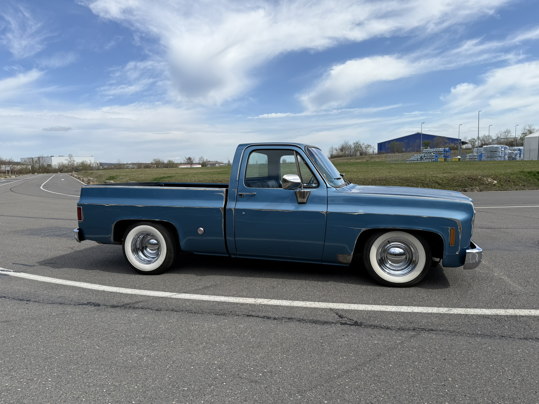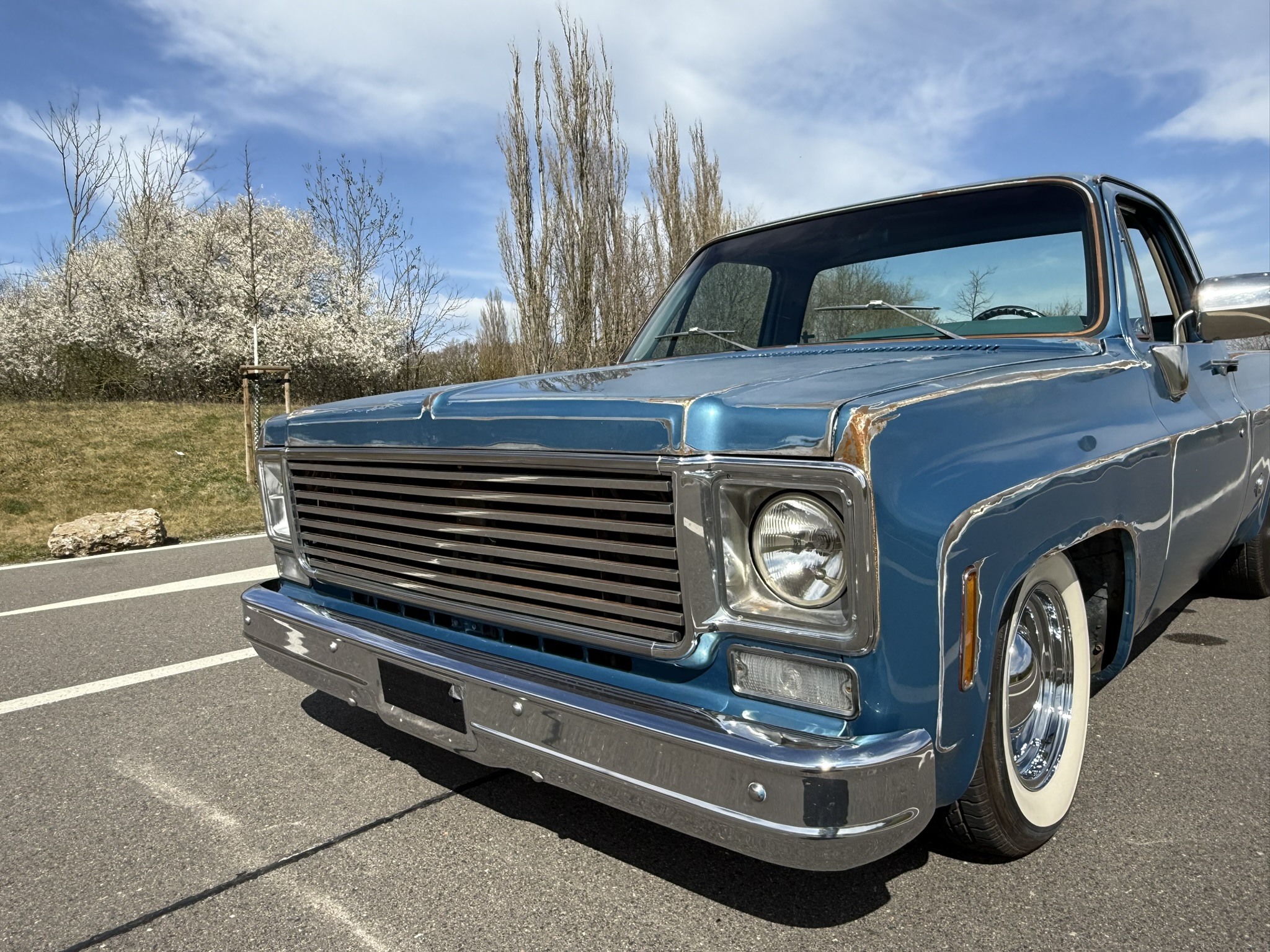 Die sogenannten Round Eyes Squarebody Pickups, so nennt man die erste Generation von 1973-1980, wegen ihrer runden Scheinwerfer, sind zweifellos am Beliebtesten. Dieses schöne Exemplar ist aus dem Jahre 1977 und kommt in der Ausstattungsvariante Cheyenne. Der Wagen hat deutsche Papiere inkl. Tüv und H. Motor ist ein 350V8 mit TH 350Getriebe. Servolenkung und Scheibenbremsen. Er wurde tiefergelegt und kommt auf Chrom Felgen mit Weisswandreifen. Das Fahrwerk ist knackig, aber noch komfortabel. Innen wurde er neu gepolstert mit Chevrolet Applikationen. Custom Grill. Der Lack ist im Used Look und wurde partiell angeschliffen. neue Chrom Stoßstangen vorne & hinten. Der Chevy kommt in der wendigen und gesuchtesten Shortbed Variante (kurze Ladefläche (2m)). Er fährt sich sehr schön und ist ein Hop in and Drive – Fahrzeug.