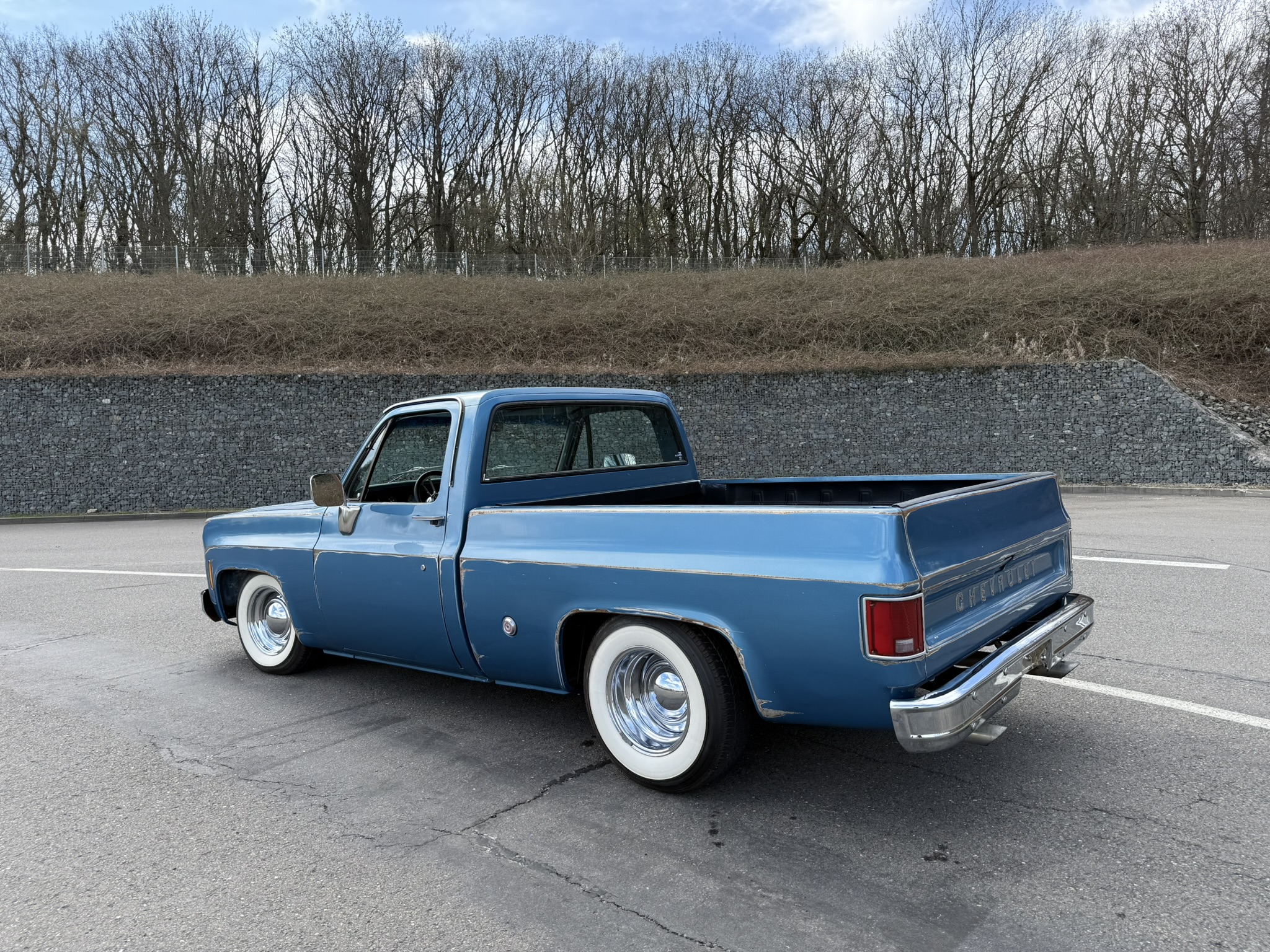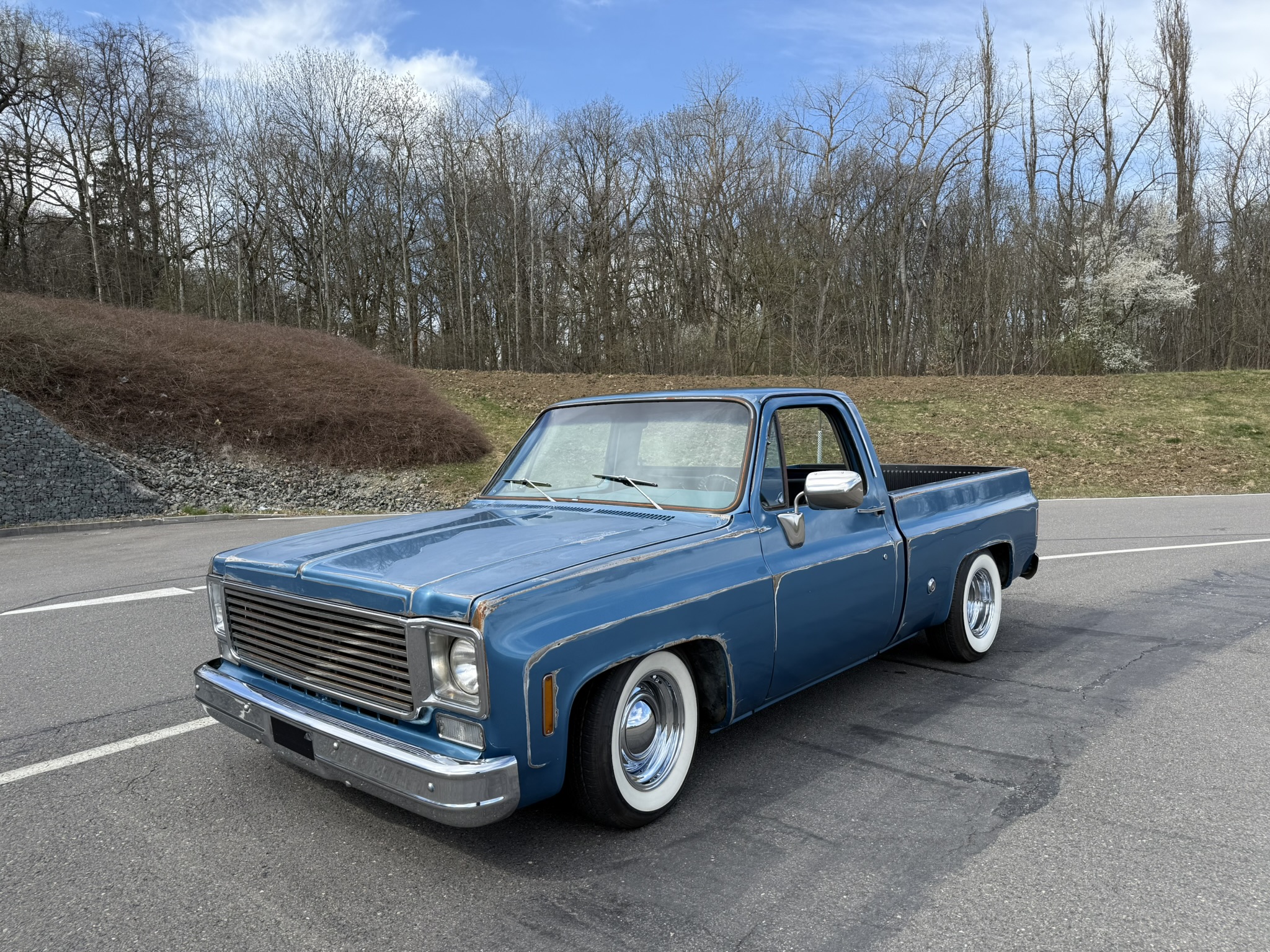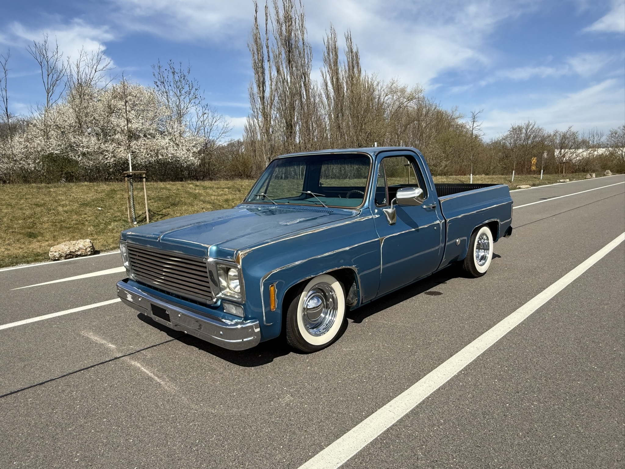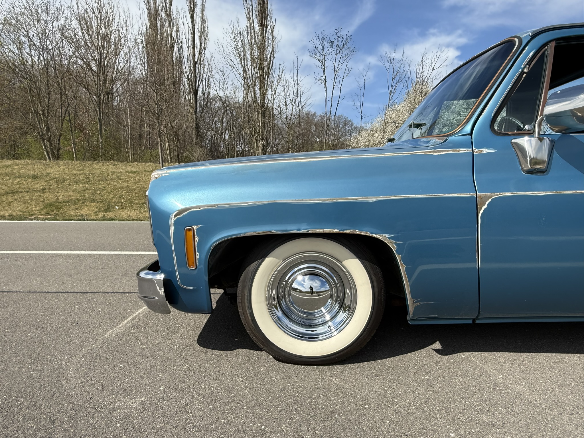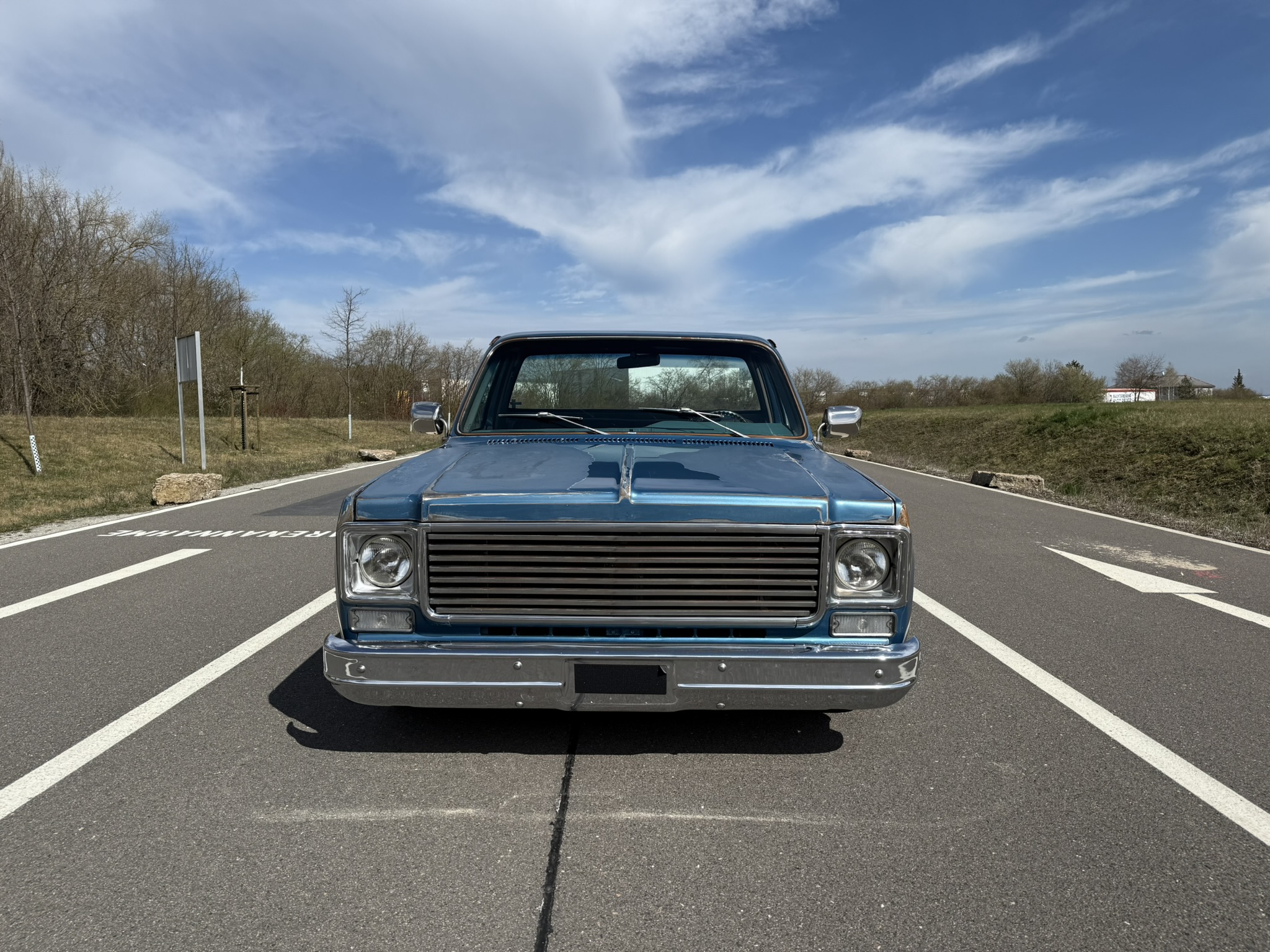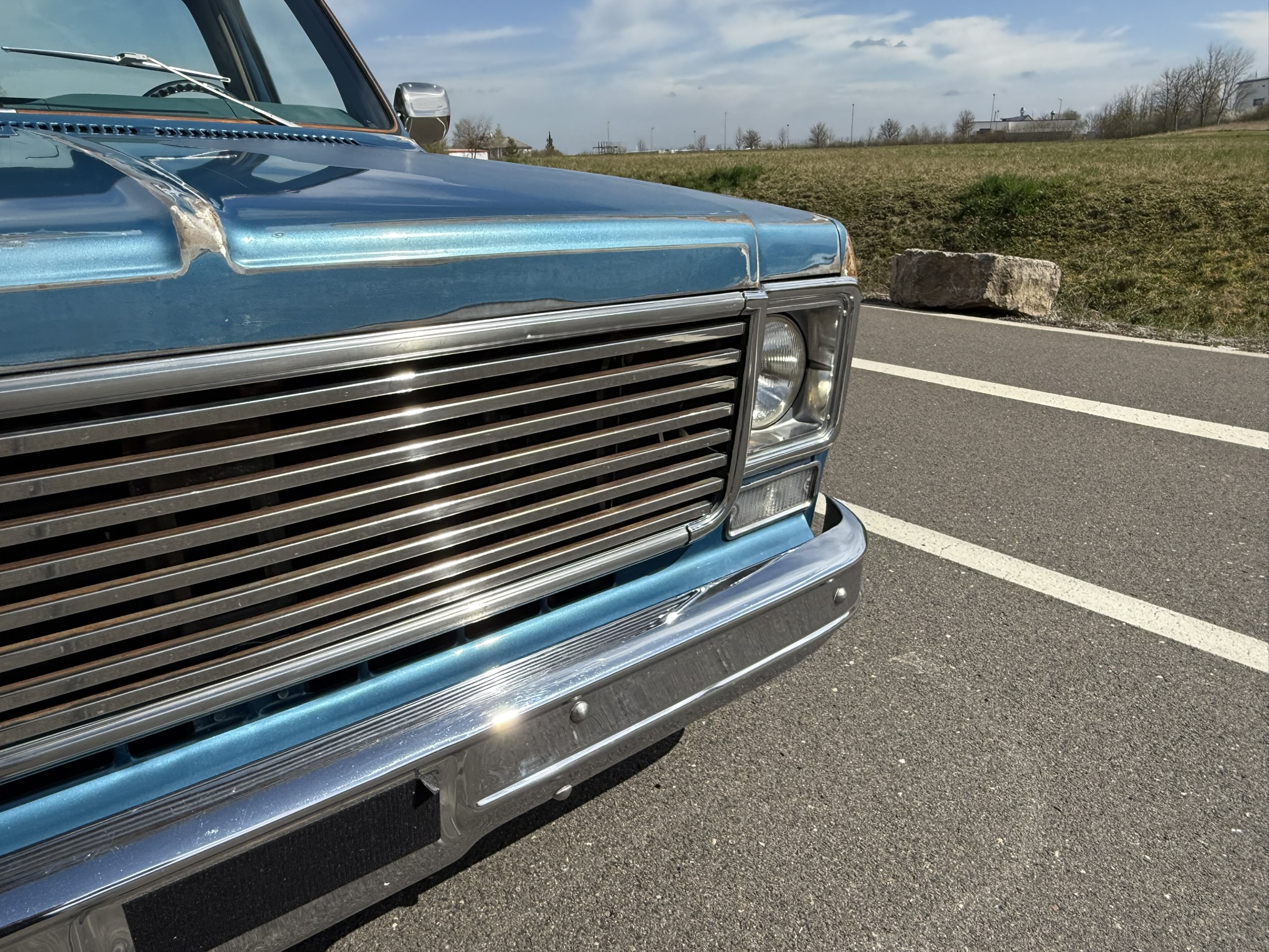 Die sogenannten Round Eyes Squarebody Pickups, so nennt man die erste Generation von 1973-1980, wegen ihrer runden Scheinwerfer, sind zweifellos am Beliebtesten. Dieses schöne Exemplar ist aus dem Jahre 1977 und kommt in der Ausstattungsvariante Cheyenne. Der Wagen hat deutsche Papiere inkl. Tüv und H. Motor ist ein 350V8 mit TH 350Getriebe. Servolenkung und Scheibenbremsen. Er wurde tiefergelegt und kommt auf Chrom Felgen mit Weisswandreifen. Das Fahrwerk ist knackig, aber noch komfortabel. Innen wurde er neu gepolstert mit Chevrolet Applikationen. Custom Grill. Der Lack ist im Used Look und wurde partiell angeschliffen. neue Chrom Stoßstangen vorne & hinten. Der Chevy kommt in der wendigen und gesuchtesten Shortbed Variante (kurze Ladefläche (2m)). Er fährt sich sehr schön und ist ein Hop in and Drive – Fahrzeug.