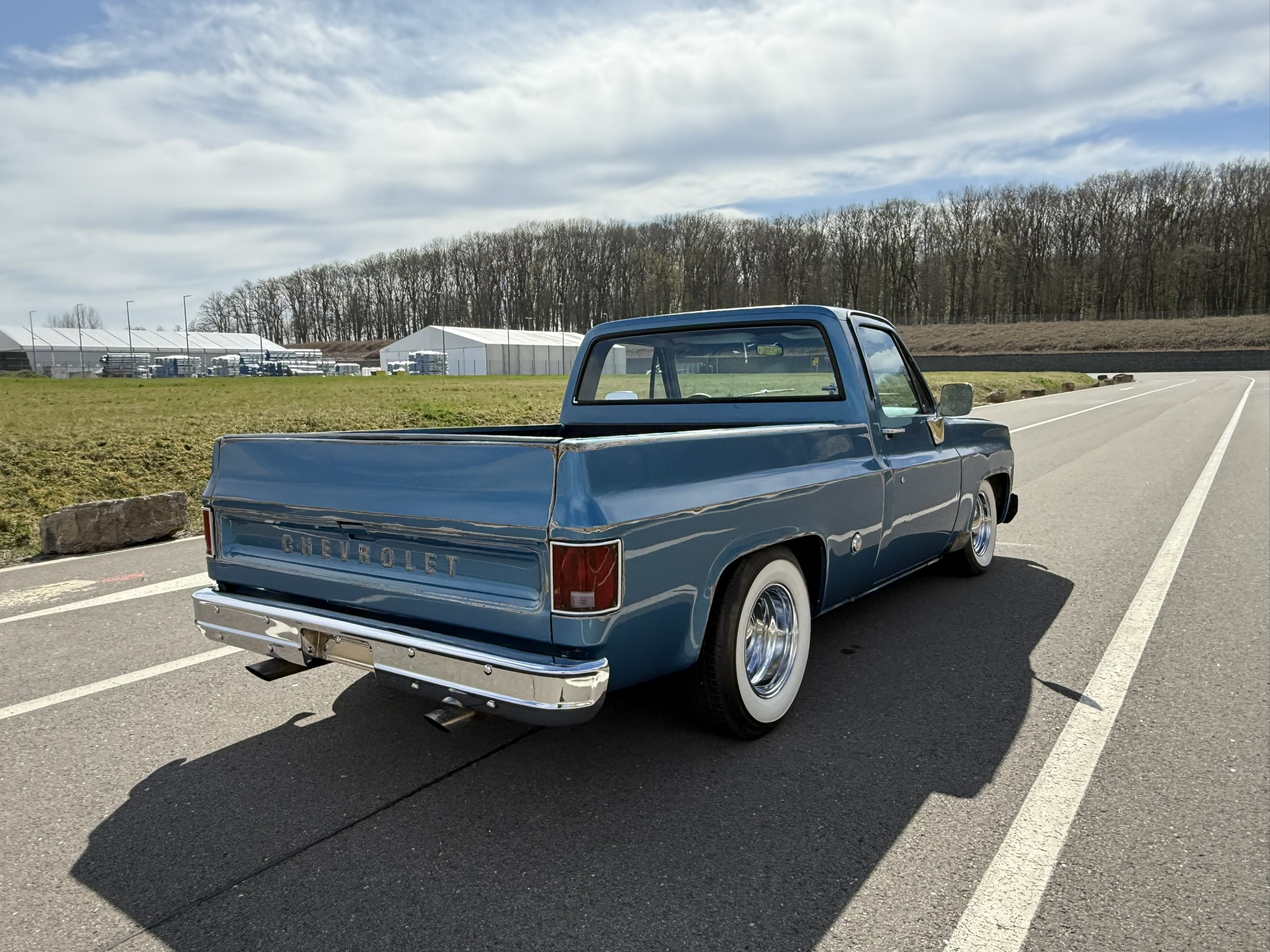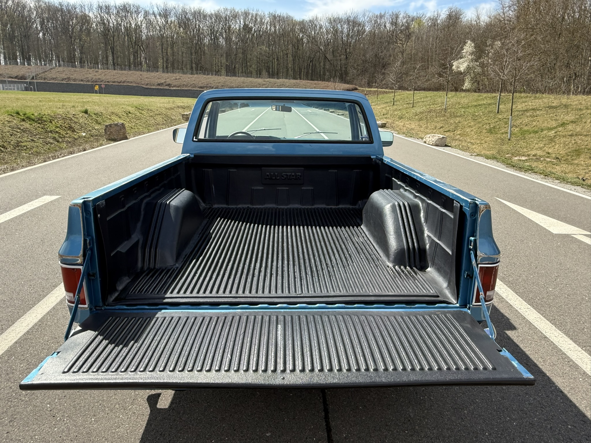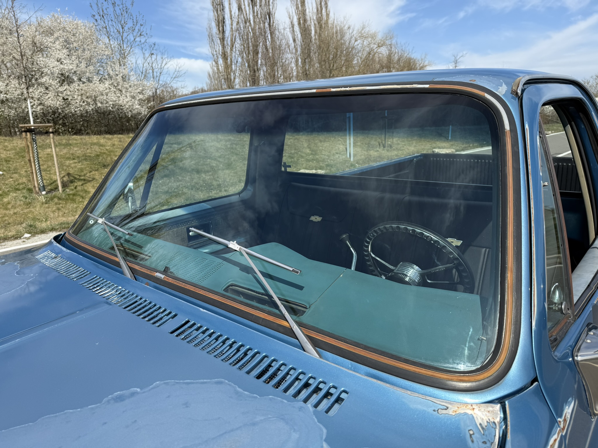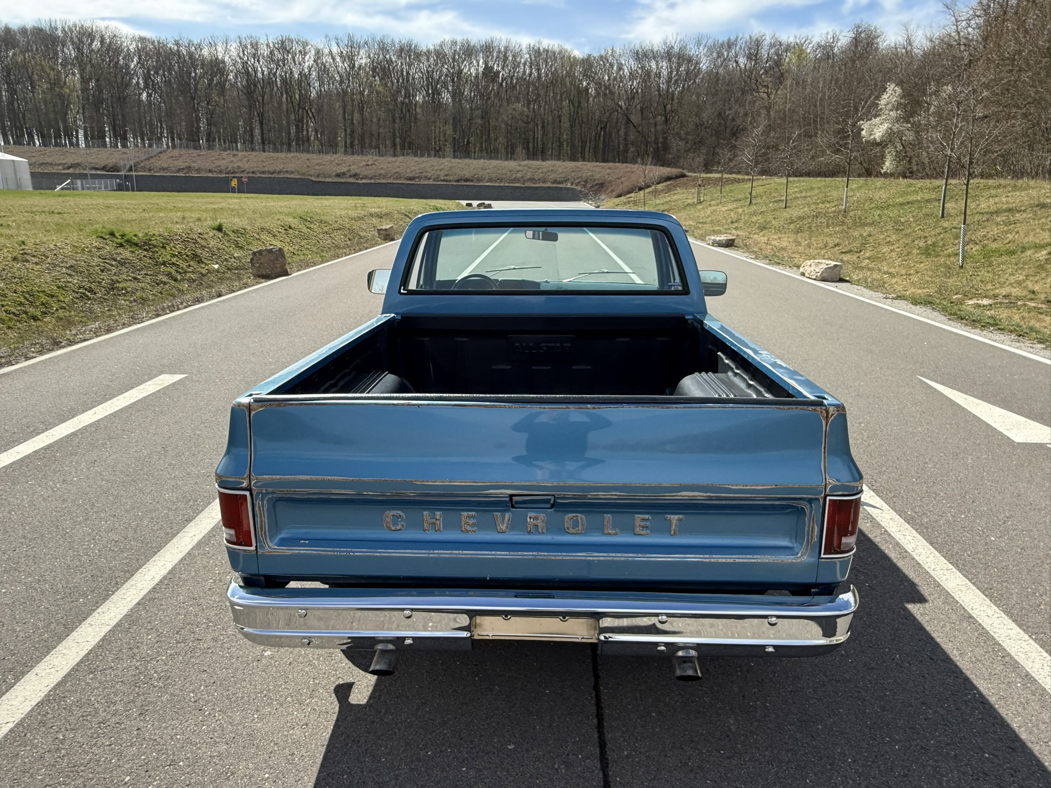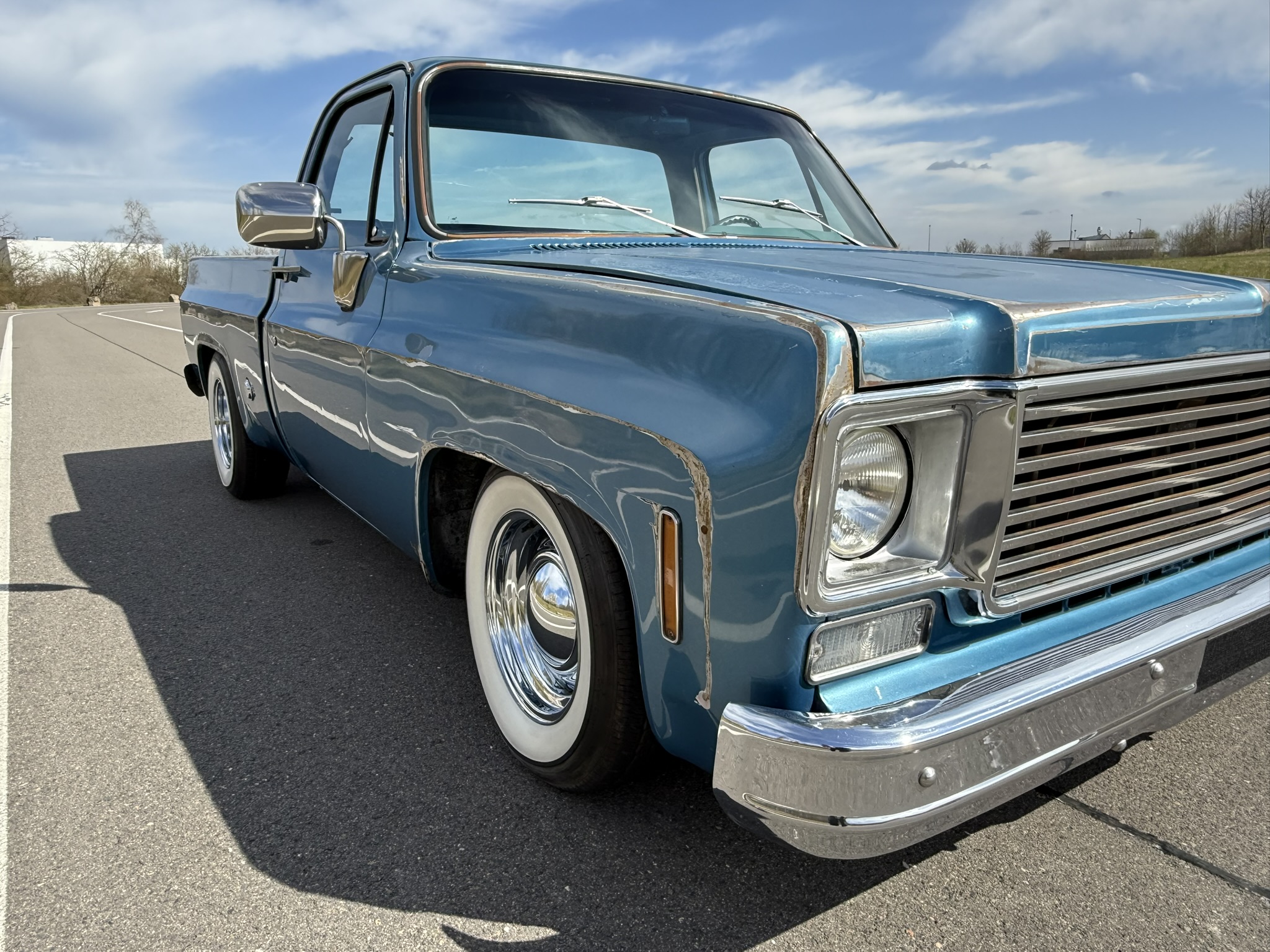 Die sogenannten Round Eyes Squarebody Pickups, so nennt man die erste Generation von 1973-1980, wegen ihrer runden Scheinwerfer, sind zweifellos am Beliebtesten. Dieses schöne Exemplar ist aus dem Jahre 1977 und kommt in der Ausstattungsvariante Cheyenne. Der Wagen hat deutsche Papiere inkl. Tüv und H. Motor ist ein 350V8 mit TH 350Getriebe. Servolenkung und Scheibenbremsen. Er wurde tiefergelegt und kommt auf Chrom Felgen mit Weisswandreifen. Das Fahrwerk ist knackig, aber noch komfortabel. Innen wurde er neu gepolstert mit Chevrolet Applikationen. Custom Grill. Der Lack ist im Used Look und wurde partiell angeschliffen. neue Chrom Stoßstangen vorne & hinten. Der Chevy kommt in der wendigen und gesuchtesten Shortbed Variante (kurze Ladefläche (2m)). Er fährt sich sehr schön und ist ein Hop in and Drive – Fahrzeug.